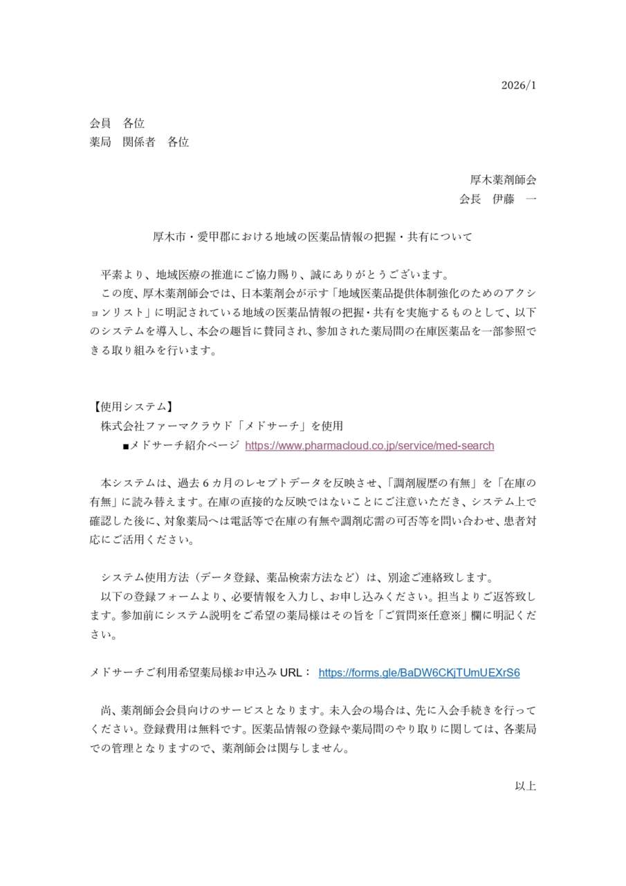 この度、厚木薬剤師会では、日本薬剤会が示す「地域医薬品提供体制強化のためのアクションリスト」に明記されている地域の医薬品情報の把握・共有を実施するものとして、薬局間在庫確認システムを導入します。