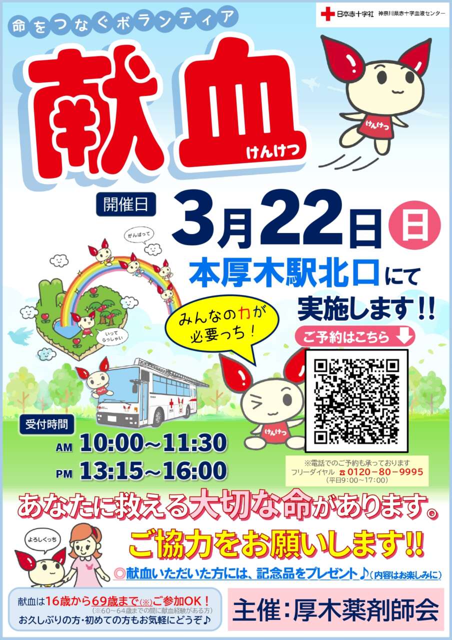 厚木薬剤師会共催 献血活動のお知らせ(3/22 開催)